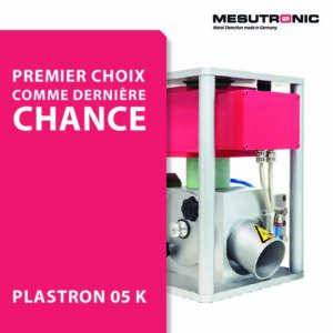 Partenaire de l’industrie du plastique, MESUTRONIC fabrique des détecteurs et séparateurs de métaux qui protègent les installations de production contre des dommages provoqués par des produits contaminés par du métal. Tous les métaux sont détectables de manière fiable (inox, fer, laiton, cuivre, etc.).